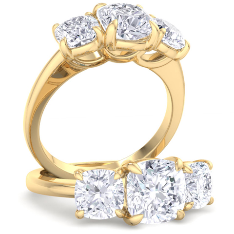 3 Carat Cushion Cut Lab Grown Diamond Three Stone Engagement Ring In 14K Yellow Gold