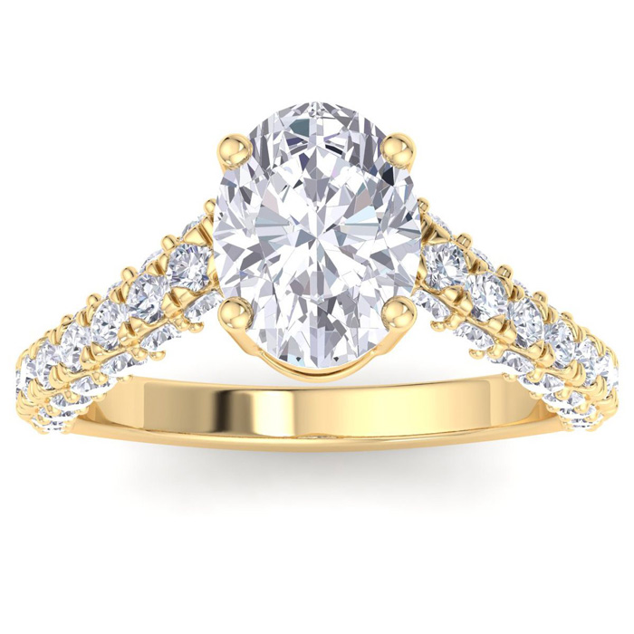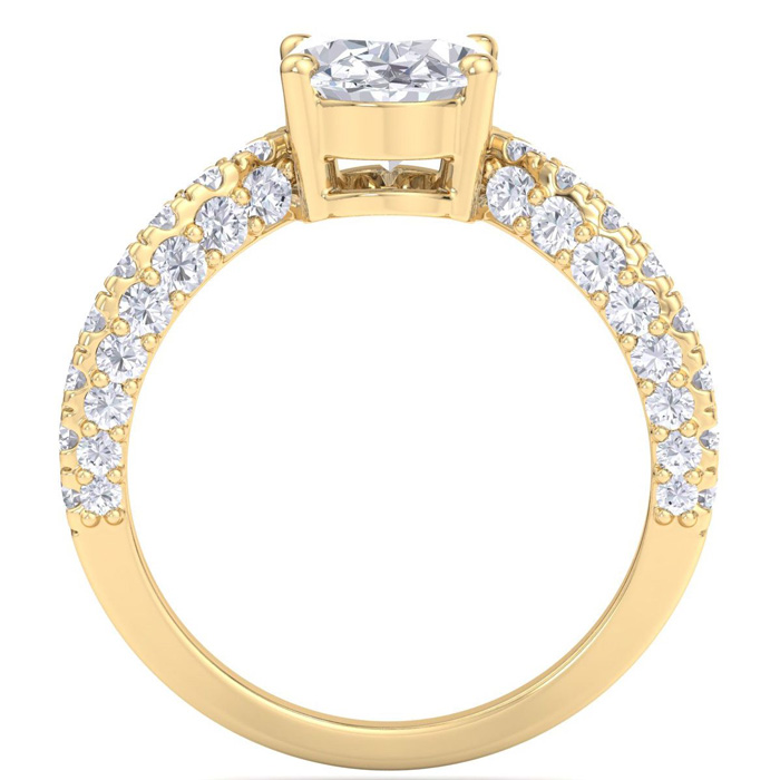 This lab grown diamond engagement ring features a 2 carat oval shape center lab grown diamond. It is accented with 48 round lab grown diamonds in G-H color, VS clarity. Total carat weight is approximately 3 carats. This ring is in 14 karat yellow gold.