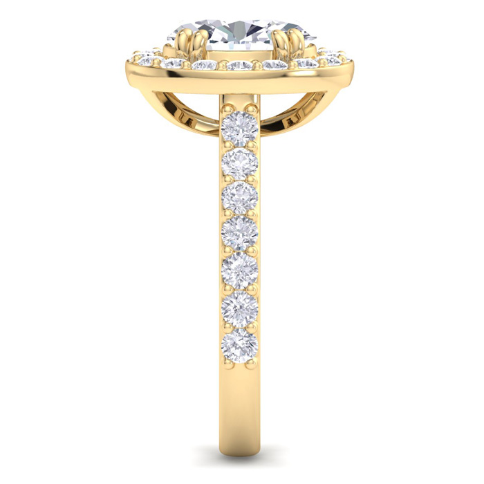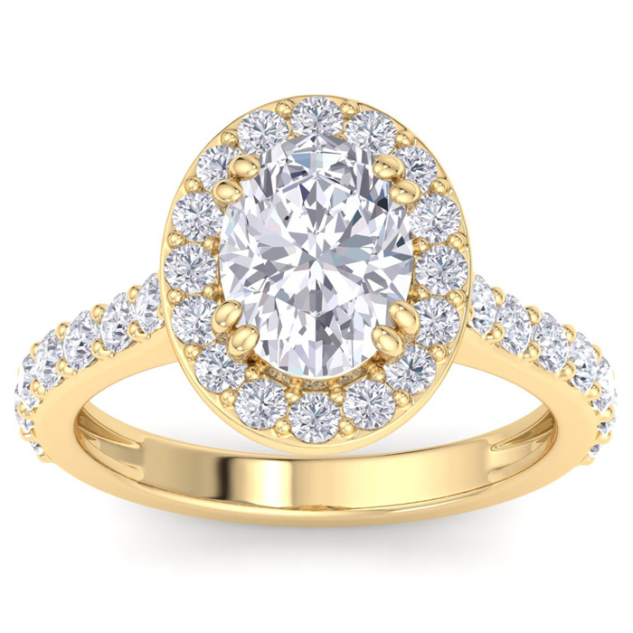 This lab grown diamond engagement ring features a 2 carat oval shape center lab grown diamond. It is accented with 30 round lab grown diamonds in a halo in G-H color, VS3 Clarity. Total carat weight is approximately 3 carats. This ring is in 14 karat yellow gold.