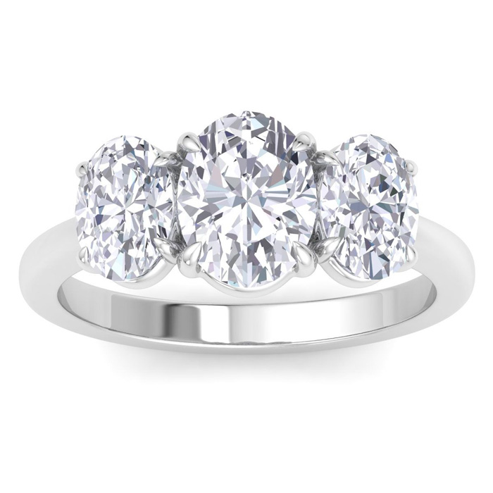 This lab grown diamond engagement ring features a 1 1/2 carat oval shape center lab grown diamond. It is accented with two oval shape lab grown diamonds in G-H color, VS clarity. Total carat weight is approximately 3 carats. This ring is in 14 karat white gold.
