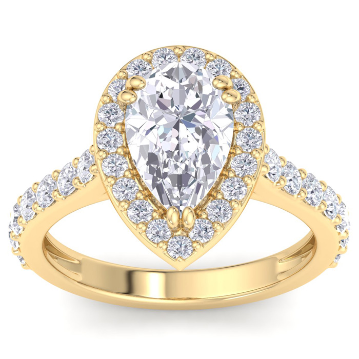 This lab grown diamond engagement ring features a 2 carat pear shape center lab grown diamond. It is accented with 35 round lab grown diamonds in a halo in G-H color, VS3 Clarity. Total carat weight is approximately 3 carats. This ring is in 14 karat yellow gold.