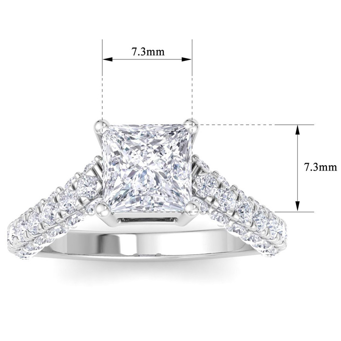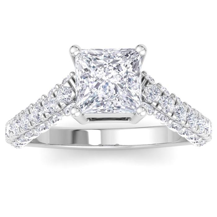 This lab grown diamond engagement ring features a 2 carat princess cut center lab grown diamond. It is accented with 48 round lab grown diamonds in G-H color, VS clarity. Total carat weight is approximately 3 carats. This ring is in 14 karat white gold.