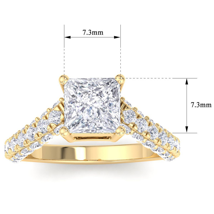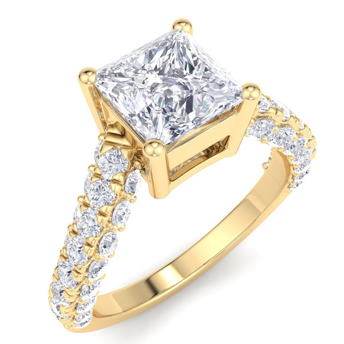 This lab grown diamond engagement ring features a 2 carat princess cut center lab grown diamond. It is accented with 48 round lab grown diamonds in G-H color, VS clarity. Total carat weight is approximately 3 carats. This ring is in 14 karat yellow gold.