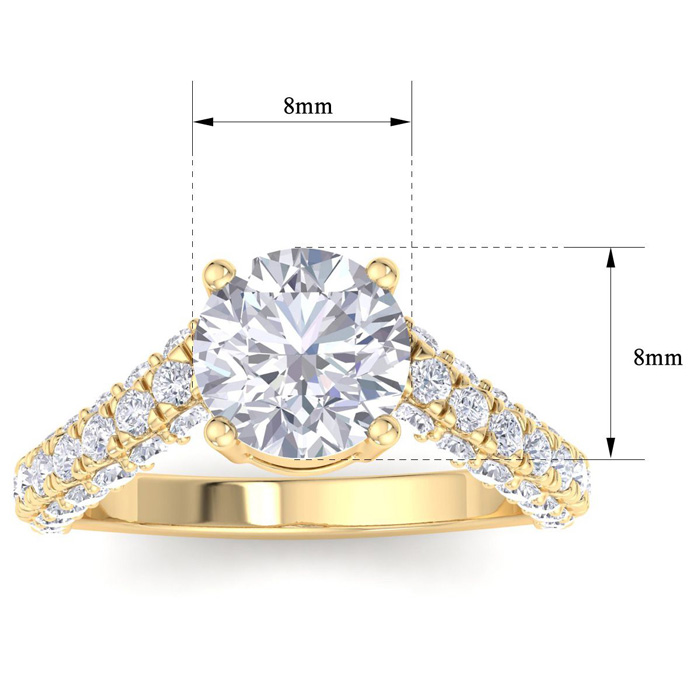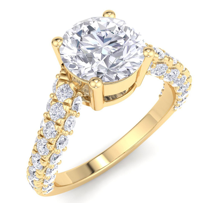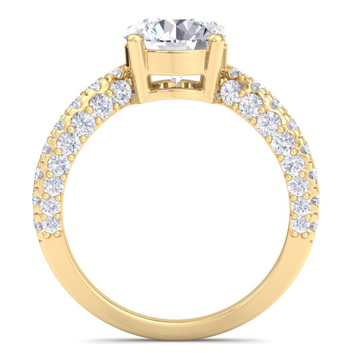 This lab grown diamond engagement ring features a 2 carat round center lab grown diamond. It is accented with 48 round lab grown diamonds in G-H color, VS clarity. Total carat weight is approximately 3 carats. This ring is in 14 karat yellow gold.