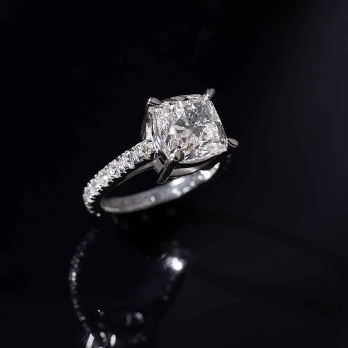 This lab grown diamond engagement ring features a 3 carat cushion cut center lab grown diamond. It is accented with 18 round lab grown diamonds in G-H color, VS clarity. Total carat weight is approximately 4 carats. This ring is in 14 karat white gold.
