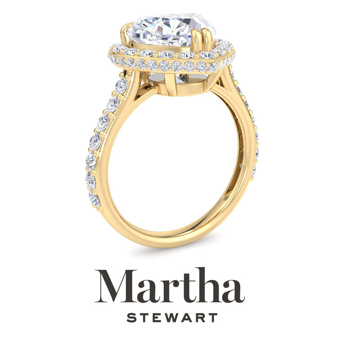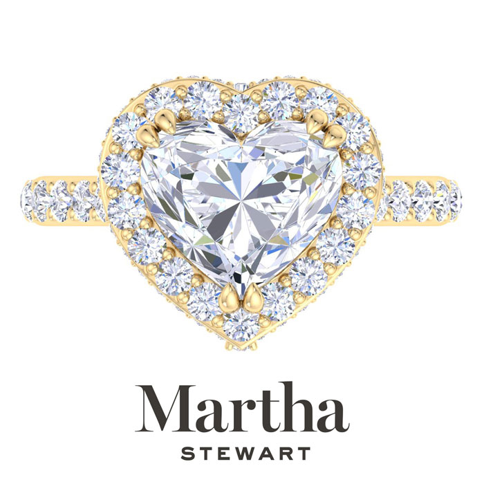 Showcasing class, style and timeless sophistication, the Martha Stewart fine jewelry collection is here to be celebrated. This Martha Stewart lab grown diamond engagement ring features a 3 carat heart shape center lab grown diamond. It is accented with 66 round lab grown diamonds in a hidden halo in G-H color, VS clarity. Total carat weight is approximately 4 carats. This ring is in 14 karat yellow gold. This Martha Stewart ring has a double-prong setting and is comfort fit for a luxurious feel on your finger. This ring also has a patent pending mirrored setting which increases the primary diamond's brilliance and beauty. Whether for a special occasion or to add a touch of elegance to everyday wear, this ring is sure to become a beloved heirloom. Martha Stewart’s dedication to quality and attention to detail are reflected in every piece, making this collection a celebration of timeless beauty and exceptional craftsmanship.
