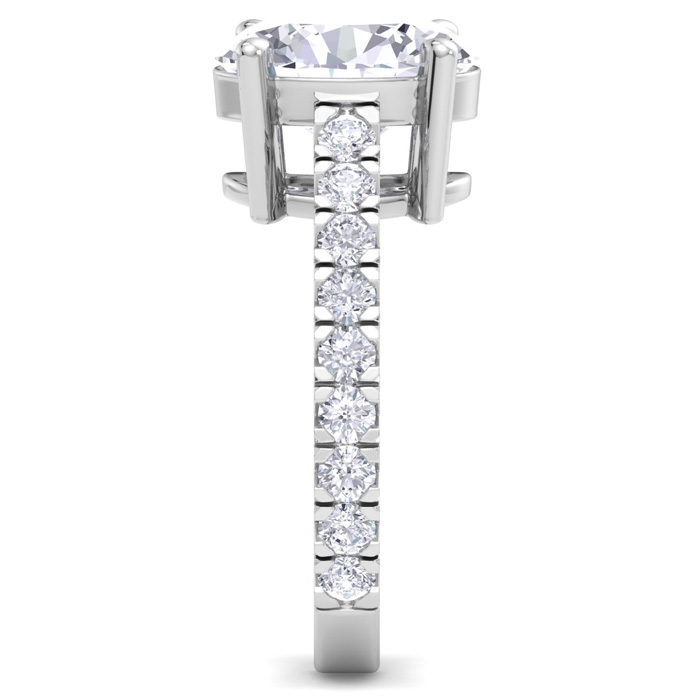 This lab grown diamond engagement ring features a 3 carat oval shape center lab grown diamond. It is accented with 18 round lab grown diamonds in G-H color, VS clarity. Total carat weight is approximately 4 carats. This ring is in 14 karat white gold.