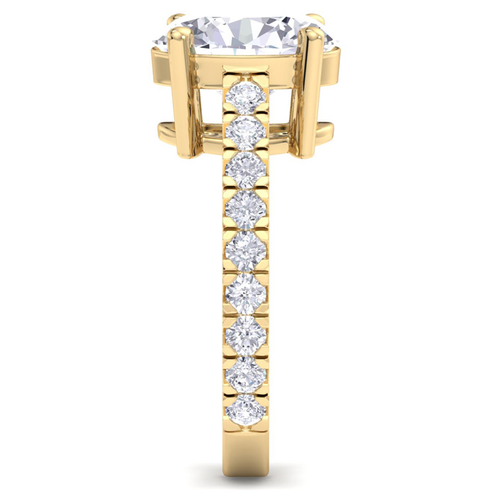 This lab grown diamond engagement ring features a 3 carat oval shape center lab grown diamond. It is accented with 18 round lab grown diamonds in G-H color, VS clarity. Total carat weight is approximately 4 carats. This ring is in 14 karat yellow gold.