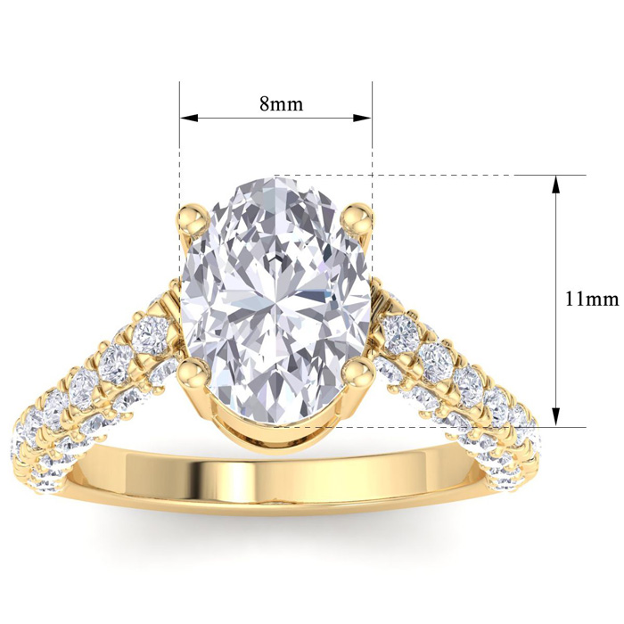 This lab grown diamond engagement ring features a 3 carat oval shape center lab grown diamond. It is accented with 48 round lab grown diamonds in G-H color, VS clarity. Total carat weight is approximately 4 carats. This ring is in 14 karat yellow gold.