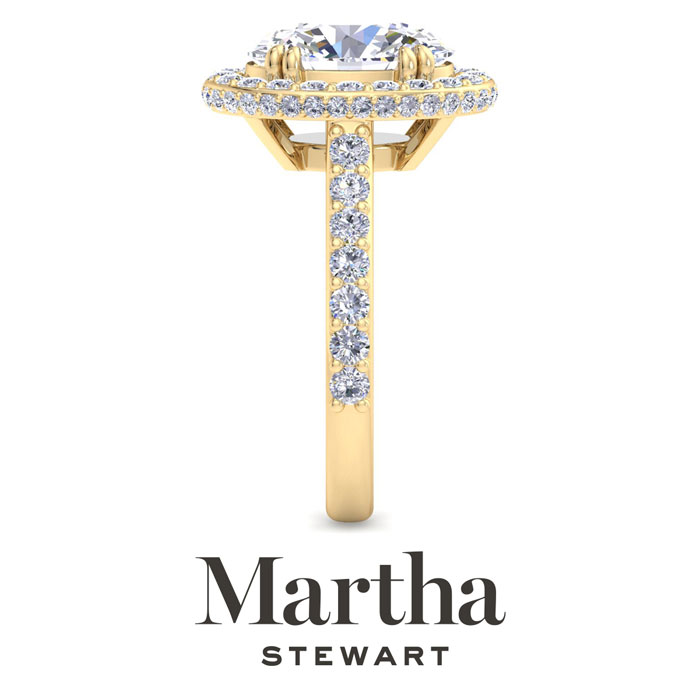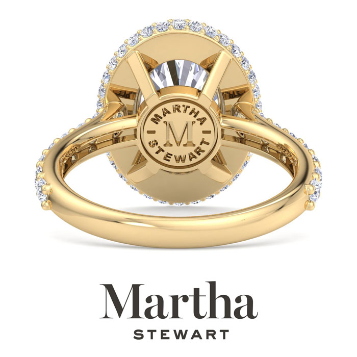 Showcasing class, style and timeless sophistication, the Martha Stewart fine jewelry collection is here to be celebrated. This Martha Stewart lab grown diamond engagement ring features a 3 carat oval shape center lab grown diamond. It is accented with 68 round lab grown diamonds in a hidden halo in G-H color, VS clarity. Total carat weight is approximately 4 carats. This ring is in 14 karat yellow gold. This Martha Stewart ring has a double-prong setting and is comfort fit for a luxurious feel on your finger. This ring also has a patent pending mirrored setting which increases the primary diamond's brilliance and beauty. Whether for a special occasion or to add a touch of elegance to everyday wear, this ring is sure to become a beloved heirloom. Martha Stewart’s dedication to quality and attention to detail are reflected in every piece, making this collection a celebration of timeless beauty and exceptional craftsmanship.