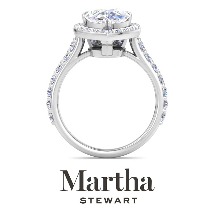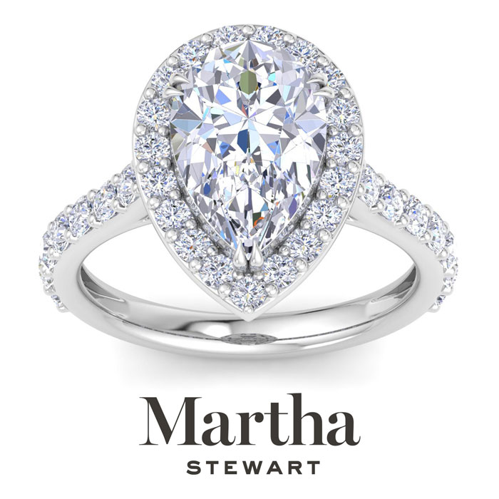 Showcasing class, style and timeless sophistication, the Martha Stewart fine jewelry collection is here to be celebrated. This Martha Stewart lab grown diamond engagement ring features a 3 carat pear shape center lab grown diamond. It is accented with 33 round lab grown diamonds in a halo in G-H color, VS clarity. Total carat weight is approximately 4 carats. This ring is in Sterling Silver. This Martha Stewart ring has a double-prong setting and is comfort fit for a luxurious feel on your finger. This ring also has a patent pending mirrored setting which increases the primary diamond's brilliance and beauty. Whether for a special occasion or to add a touch of elegance to everyday wear, this ring is sure to become a beloved heirloom. Martha Stewart’s dedication to quality and attention to detail are reflected in every piece, making this collection a celebration of timeless beauty and exceptional craftsmanship.