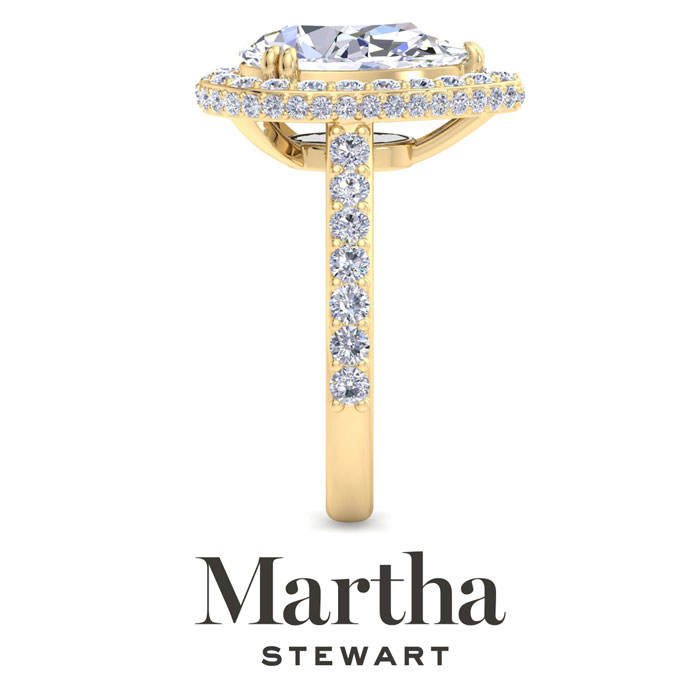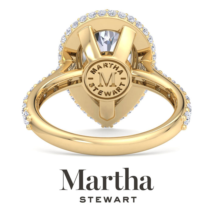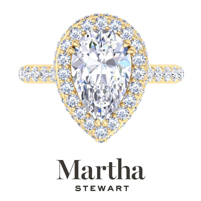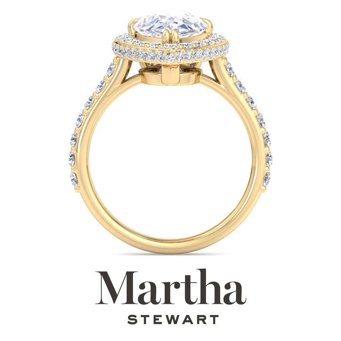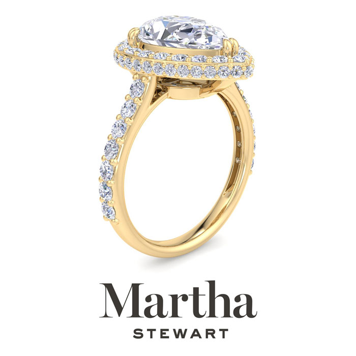 Showcasing class, style and timeless sophistication, the Martha Stewart fine jewelry collection is here to be celebrated. This Martha Stewart lab grown diamond engagement ring features a 3 carat pear shape center lab grown diamond. It is accented with 69 round lab grown diamonds in a hidden halo in G-H color, VS clarity. Total carat weight is approximately 4 carats. This ring is in 14 karat yellow gold. This Martha Stewart ring has a double-prong setting and is comfort fit for a luxurious feel on your finger. This ring also has a patent pending mirrored setting which increases the primary diamond's brilliance and beauty. Whether for a special occasion or to add a touch of elegance to everyday wear, this ring is sure to become a beloved heirloom. Martha Stewart’s dedication to quality and attention to detail are reflected in every piece, making this collection a celebration of timeless beauty and exceptional craftsmanship.