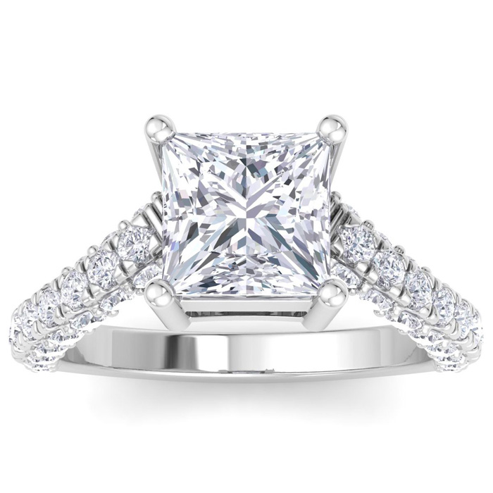 This lab grown diamond engagement ring features a 3 carat princess cut center lab grown diamond. It is accented with 48 round lab grown diamonds in G-H color, VS clarity. Total carat weight is approximately 4 carats. This ring is in 14 karat white gold.