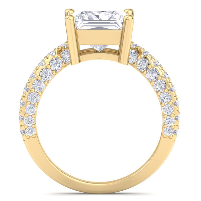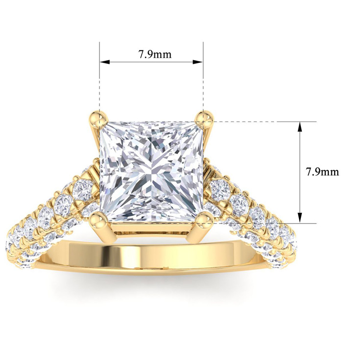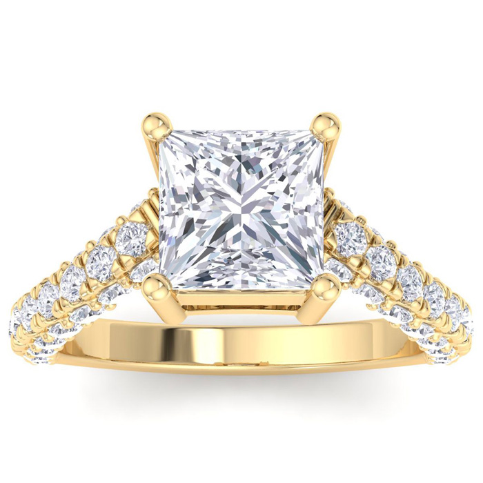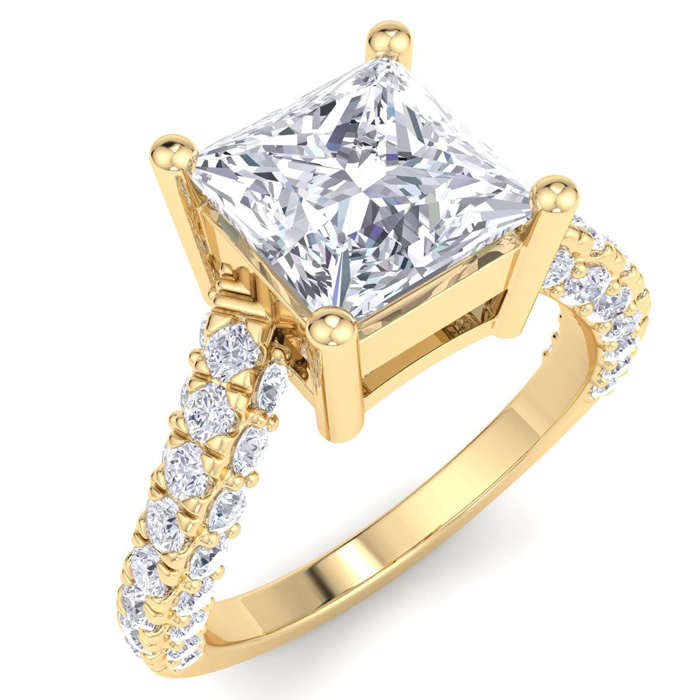 This lab grown diamond engagement ring features a 3 carat princess cut center lab grown diamond. It is accented with 48 round lab grown diamonds in G-H color, VS clarity. Total carat weight is approximately 4 carats. This ring is in 14 karat yellow gold.