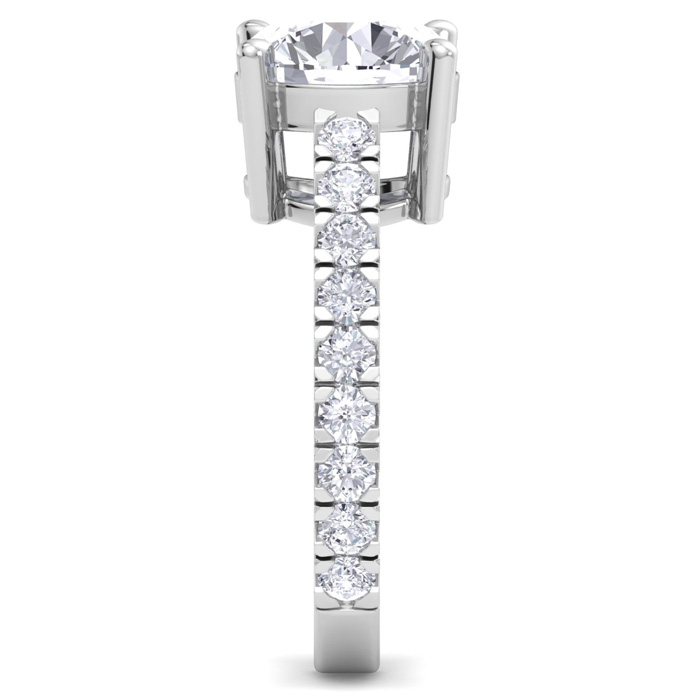 This lab grown diamond engagement ring features a 3 carat round center lab grown diamond. It is accented with 18 round lab grown diamonds in G-H color, VS clarity. Total carat weight is approximately 4 carats. This ring is in 14 karat white gold.