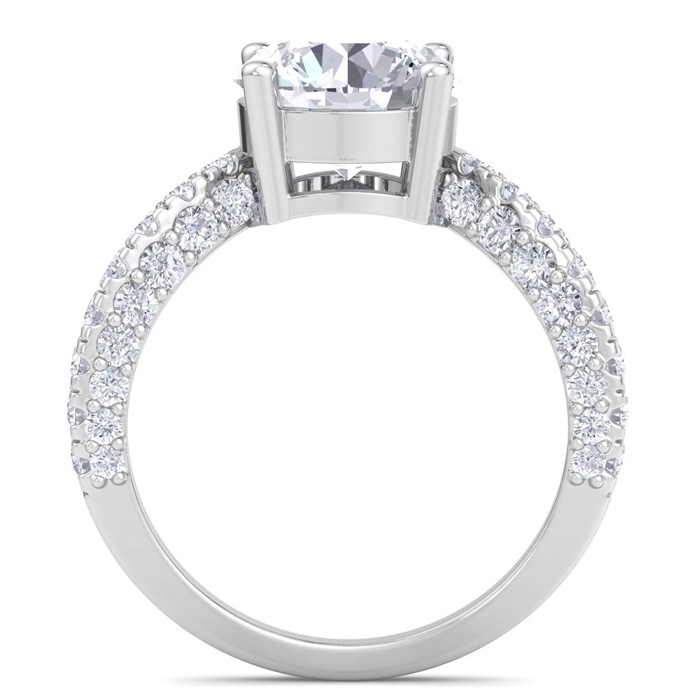 This lab grown diamond engagement ring features a 3 carat round center lab grown diamond. It is accented with 48 round lab grown diamonds in G-H color, VS clarity. Total carat weight is approximately 4 carats. This ring is in 14 karat white gold.
