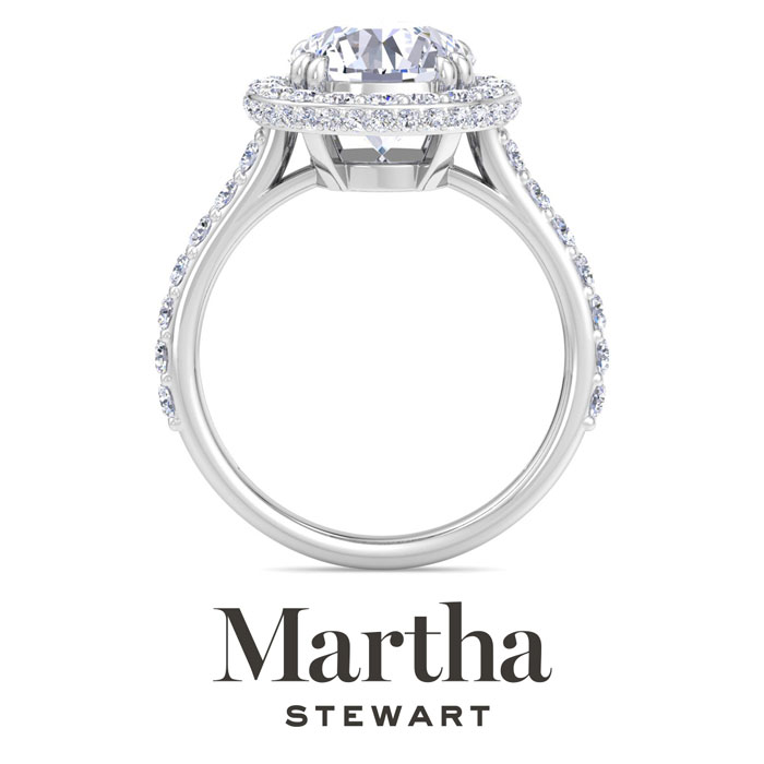 Showcasing class, style and timeless sophistication, the Martha Stewart fine jewelry collection is here to be celebrated. This Martha Stewart lab grown diamond engagement ring features a 3 carat round center lab grown diamond. It is accented with 64 round lab grown diamonds in a hidden halo in G-H color, VS clarity. Total carat weight is approximately 4 carats. This ring is in 14 karat white gold. This Martha Stewart ring has a double-prong setting and is comfort fit for a luxurious feel on your finger. This ring also has a patent pending mirrored setting which increases the primary diamond's brilliance and beauty. Whether for a special occasion or to add a touch of elegance to everyday wear, this ring is sure to become a beloved heirloom. Martha Stewart’s dedication to quality and attention to detail are reflected in every piece, making this collection a celebration of timeless beauty and exceptional craftsmanship.