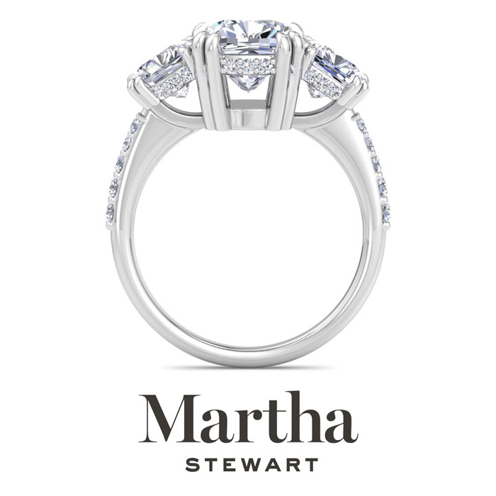 Showcasing class, style and timeless sophistication, the Martha Stewart fine jewelry collection is here to be celebrated. This Martha Stewart lab grown diamond engagement ring features a 3 carat cushion cut center lab grown diamond. It is accented with two cushion cut lab grown diamonds in G-H color, VS clarity. There are 34 additional lab grown diamonds in accenting halos. Total carat weight is approximately 5 1/2 carats. This ring is in Sterling Silver. This Martha Stewart ring has a double-prong setting and is comfort fit for a luxurious feel on your finger. This ring also has a patent pending mirrored setting which increases the primary diamond's brilliance and beauty. Whether for a special occasion or to add a touch of elegance to everyday wear, this ring is sure to become a beloved heirloom. Martha Stewart’s dedication to quality and attention to detail are reflected in every piece, making this collection a celebration of timeless beauty and exceptional craftsmanship.