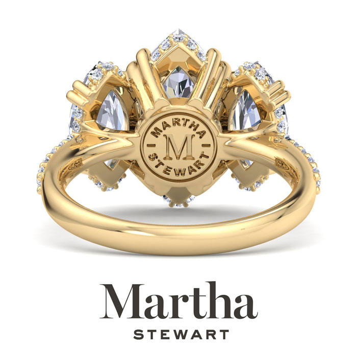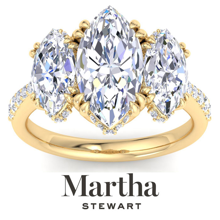 Showcasing class, style and timeless sophistication, the Martha Stewart fine jewelry collection is here to be celebrated. This Martha Stewart lab grown diamond engagement ring features a 3 carat marquise shape center lab grown diamond. It is accented with two marquise shape lab grown diamonds in G-H color, VS clarity. There are 40 additional lab grown diamonds in accenting halos. Total carat weight is approximately 5 1/2 carats. This ring is in 14 karat yellow gold. This Martha Stewart ring has a double-prong setting and is comfort fit for a luxurious feel on your finger. This ring also has a patent pending mirrored setting which increases the primary diamond's brilliance and beauty. Whether for a special occasion or to add a touch of elegance to everyday wear, this ring is sure to become a beloved heirloom. Martha Stewart’s dedication to quality and attention to detail are reflected in every piece, making this collection a celebration of timeless beauty and exceptional craftsmanship.