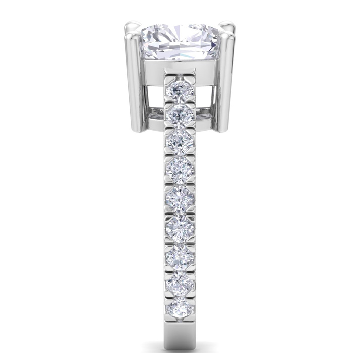 This lab grown diamond engagement ring features a 4 carat cushion cut center lab grown diamond. It is accented with 18 round lab grown diamonds in G-H color, VS clarity. Total carat weight is approximately 5 carats. This ring is in 14 karat white gold.