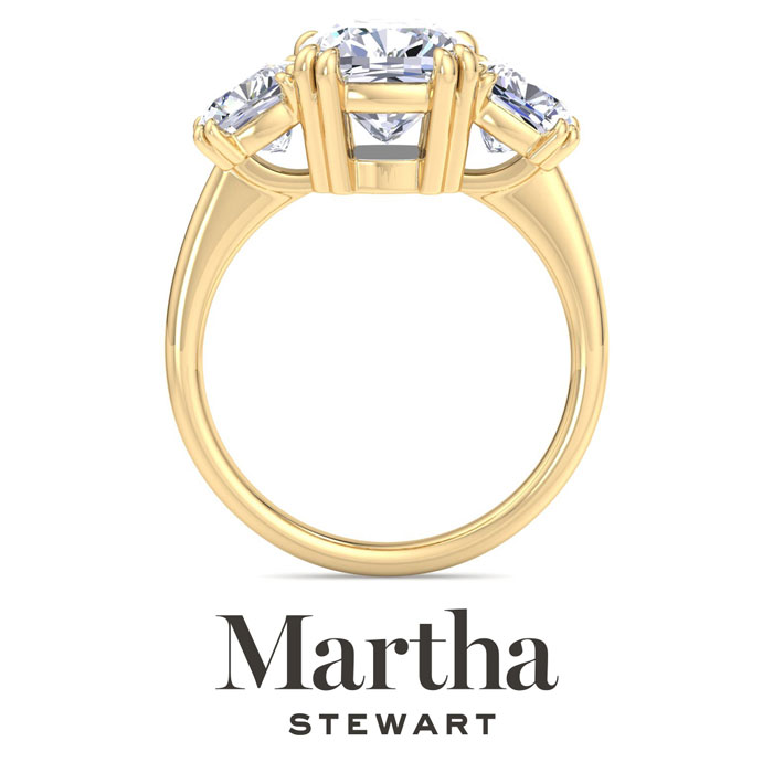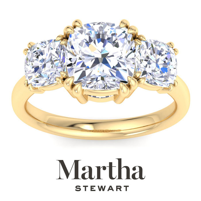 Showcasing class, style and timeless sophistication, the Martha Stewart fine jewelry collection is here to be celebrated. This Martha Stewart lab grown diamond engagement ring features a 3 carat cushion cut center lab grown diamond. It is accented with two cushion cut lab grown diamonds in G-H color, VS clarity. Total carat weight is approximately 5 carats. This ring is in 14 karat yellow gold. This Martha Stewart ring has a double-prong setting and is comfort fit for a luxurious feel on your finger. This ring also has a patent pending mirrored setting which increases the primary diamond's brilliance and beauty. Whether for a special occasion or to add a touch of elegance to everyday wear, this ring is sure to become a beloved heirloom. Martha Stewart’s dedication to quality and attention to detail are reflected in every piece, making this collection a celebration of timeless beauty and exceptional craftsmanship.
