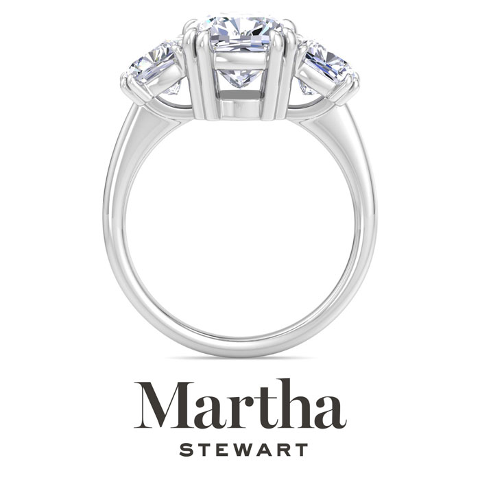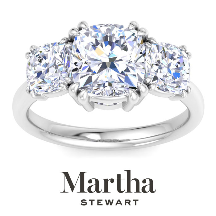 Showcasing class, style and timeless sophistication, the Martha Stewart fine jewelry collection is here to be celebrated. This Martha Stewart lab grown diamond engagement ring features a 3 carat cushion cut center lab grown diamond. It is accented with two cushion cut lab grown diamonds in G-H color, VS clarity. Total carat weight is approximately 5 carats. This ring is in Sterling Silver. This Martha Stewart ring has a double-prong setting and is comfort fit for a luxurious feel on your finger. This ring also has a patent pending mirrored setting which increases the primary diamond's brilliance and beauty. Whether for a special occasion or to add a touch of elegance to everyday wear, this ring is sure to become a beloved heirloom. Martha Stewart’s dedication to quality and attention to detail are reflected in every piece, making this collection a celebration of timeless beauty and exceptional craftsmanship.