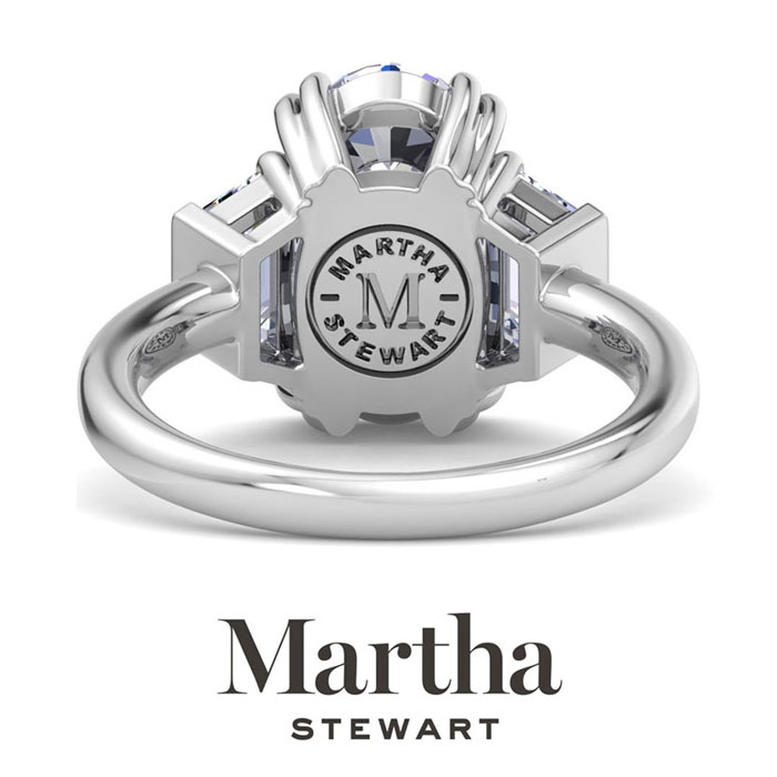 Showcasing class, style and timeless sophistication, the Martha Stewart fine jewelry collection is here to be celebrated. This Martha Stewart lab grown diamond engagement ring features a 4 carat oval shape center lab grown diamond. It is accented with two trapezoid lab grown diamonds in G-H color, VS clarity. Total carat weight is approximately 5 carats. This ring is in 14 karat white gold. This Martha Stewart ring has a double-prong setting and is comfort fit for a luxurious feel on your finger. This ring also has a patent pending mirrored setting which increases the primary diamond's brilliance and beauty. Whether for a special occasion or to add a touch of elegance to everyday wear, this ring is sure to become a beloved heirloom. Martha Stewart’s dedication to quality and attention to detail are reflected in every piece, making this collection a celebration of timeless beauty and exceptional craftsmanship.
