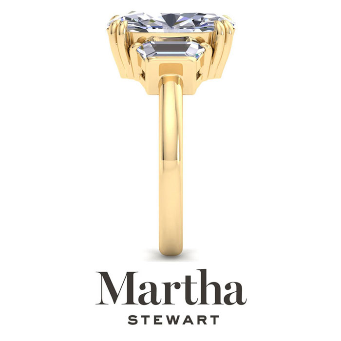 Showcasing class, style and timeless sophistication, the Martha Stewart fine jewelry collection is here to be celebrated. This Martha Stewart lab grown diamond engagement ring features a 4 carat oval shape center lab grown diamond. It is accented with two trapezoid lab grown diamonds in G-H color, VS clarity. Total carat weight is approximately 5 carats. This ring is in 14 karat yellow gold. This Martha Stewart ring has a double-prong setting and is comfort fit for a luxurious feel on your finger. This ring also has a patent pending mirrored setting which increases the primary diamond's brilliance and beauty. Whether for a special occasion or to add a touch of elegance to everyday wear, this ring is sure to become a beloved heirloom. Martha Stewart’s dedication to quality and attention to detail are reflected in every piece, making this collection a celebration of timeless beauty and exceptional craftsmanship.