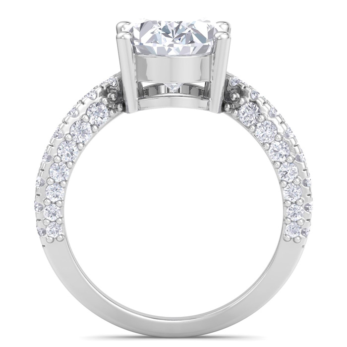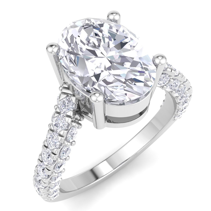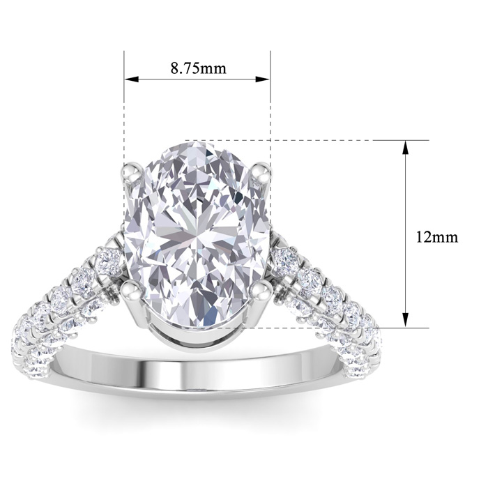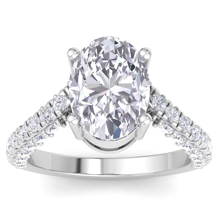 This lab grown diamond engagement ring features a 4 carat oval shape center lab grown diamond. It is accented with 46 round lab grown diamonds in G-H color, VS clarity. Total carat weight is approximately 5 carats. This ring is in 14 karat white gold.