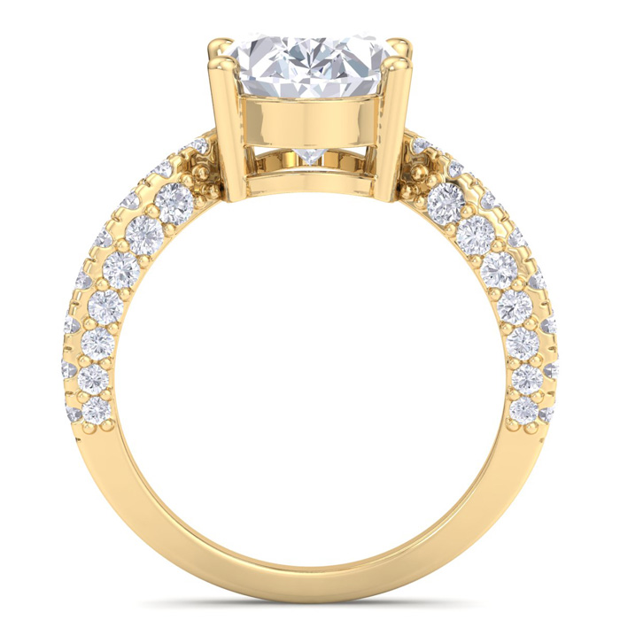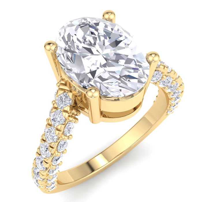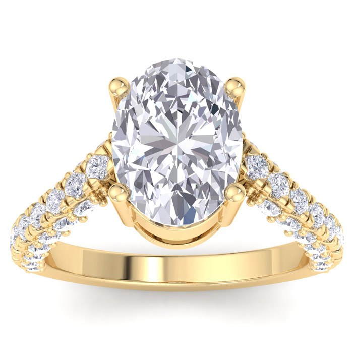This lab grown diamond engagement ring features a 4 carat oval shape center lab grown diamond. It is accented with 46 round lab grown diamonds in G-H color, VS clarity. Total carat weight is approximately 5 carats. This ring is in 14 karat yellow gold.