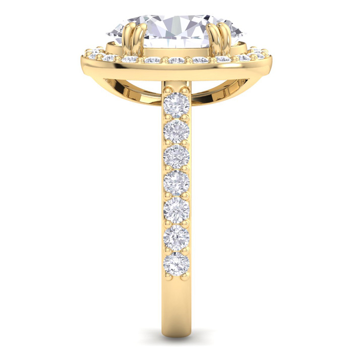 This lab grown diamond engagement ring features a 4 carat oval shape center lab grown diamond. It is accented with 34 round lab grown diamonds in a halo in G-H color, VS clarity. Total carat weight is approximately 5 carats. This ring is in 14 karat yellow gold.
