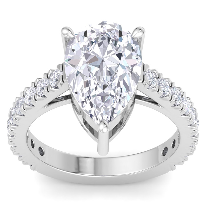 This lab grown diamond engagement ring features a 4 carat pear shape center lab grown diamond. It is accented with 18 round lab grown diamonds in G-H color, VS clarity. Total carat weight is approximately 5 carats. This ring is in 14 karat white gold.