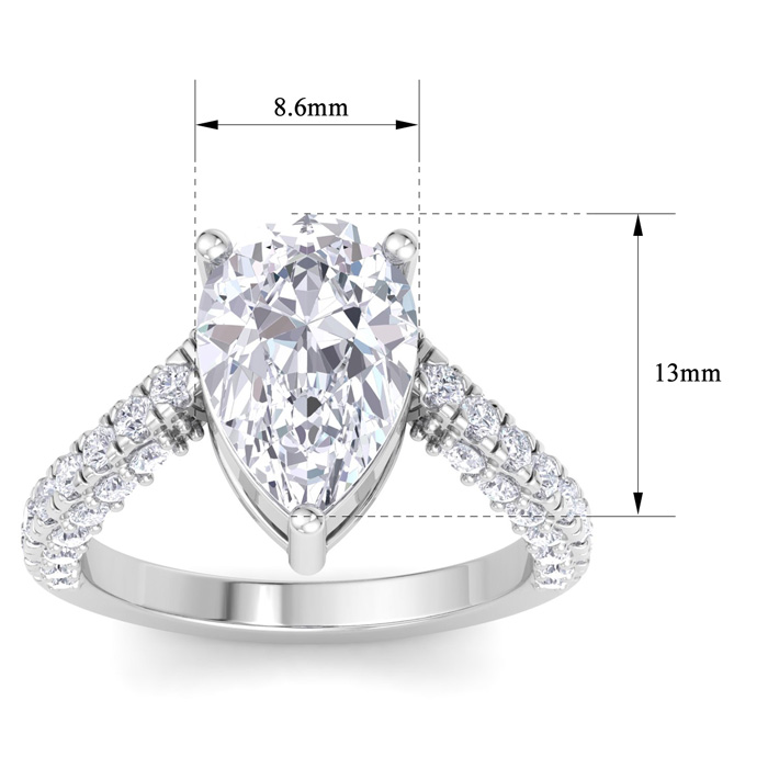 This lab grown diamond engagement ring features a 4 carat pear shape center lab grown diamond. It is accented with 46 round lab grown diamonds in G-H color, VS clarity. Total carat weight is approximately 5 carats. This ring is in 14 karat white gold.