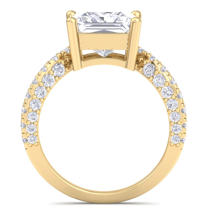 This lab grown diamond engagement ring features a 4 carat princess cut center lab grown diamond. It is accented with 46 round lab grown diamonds in G-H color, VS clarity. Total carat weight is approximately 5 carats. This ring is in 14 karat yellow gold.
