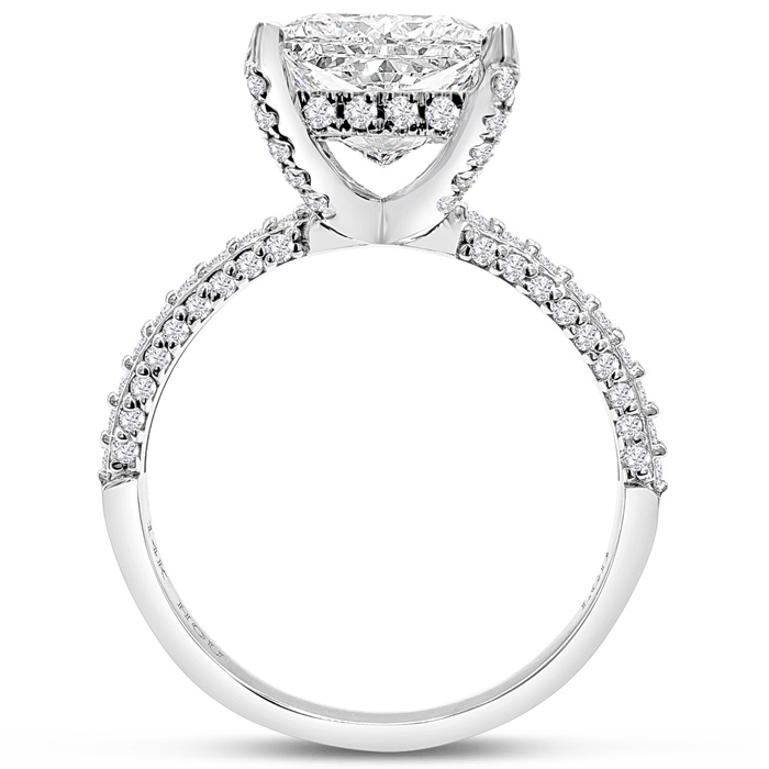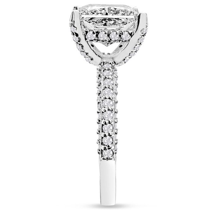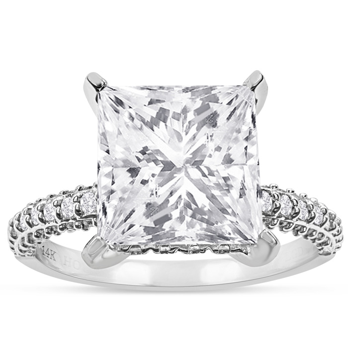 This lab grown diamond engagement ring features a 4 carat princess cut center lab grown diamond. It is accented with 90 round lab grown diamonds in G-H color, VS clarity. Total carat weight is approximately 5 carats. This ring is in 14 karat white gold.