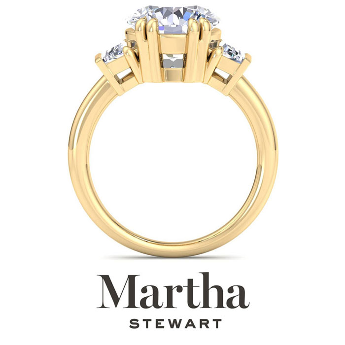 Showcasing class, style and timeless sophistication, the Martha Stewart fine jewelry collection is here to be celebrated. This Martha Stewart lab grown diamond engagement ring features a 4 carat round center lab grown diamond. It is accented with two trapezoid lab grown diamonds in G-H color, VS clarity. Total carat weight is approximately 5 carats. This ring is in 14 karat yellow gold. This Martha Stewart ring has a double-prong setting and is comfort fit for a luxurious feel on your finger. This ring also has a patent pending mirrored setting which increases the primary diamond's brilliance and beauty. Whether for a special occasion or to add a touch of elegance to everyday wear, this ring is sure to become a beloved heirloom. Martha Stewart’s dedication to quality and attention to detail are reflected in every piece, making this collection a celebration of timeless beauty and exceptional craftsmanship.