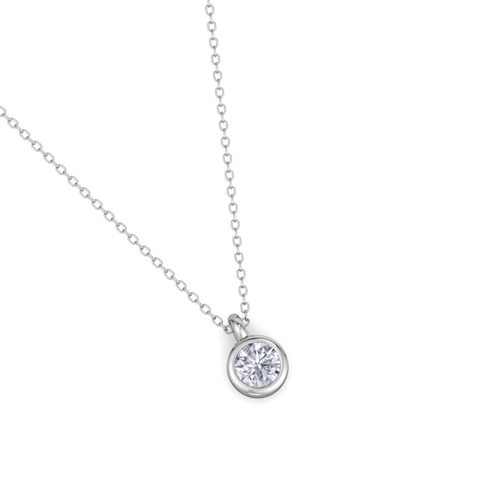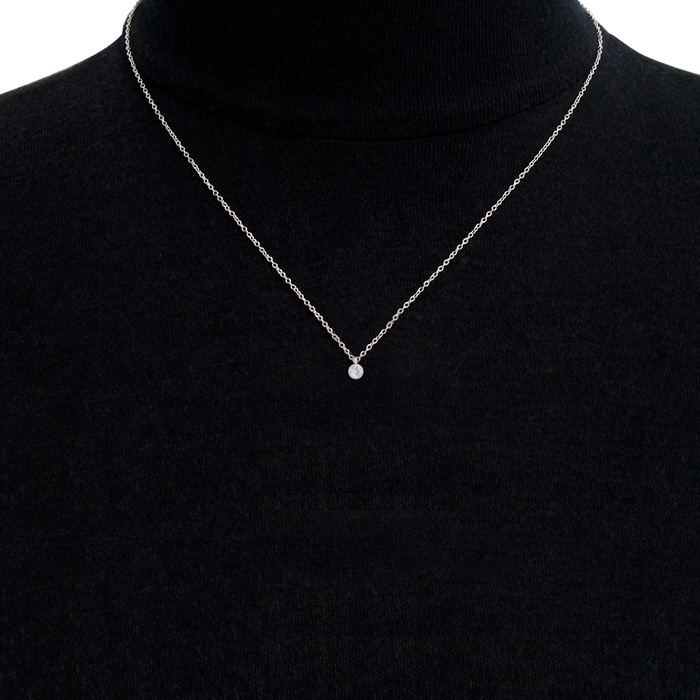 This diamond necklace features 1 sparkling lab grown diamond in a bezel setting. Total carat weight is 0.06 carats. Diamond color is G-H, diamond clarity is VS. This necklace is in sterling silver and comes with an 18 inch cable chain with a spring-ring clasp.