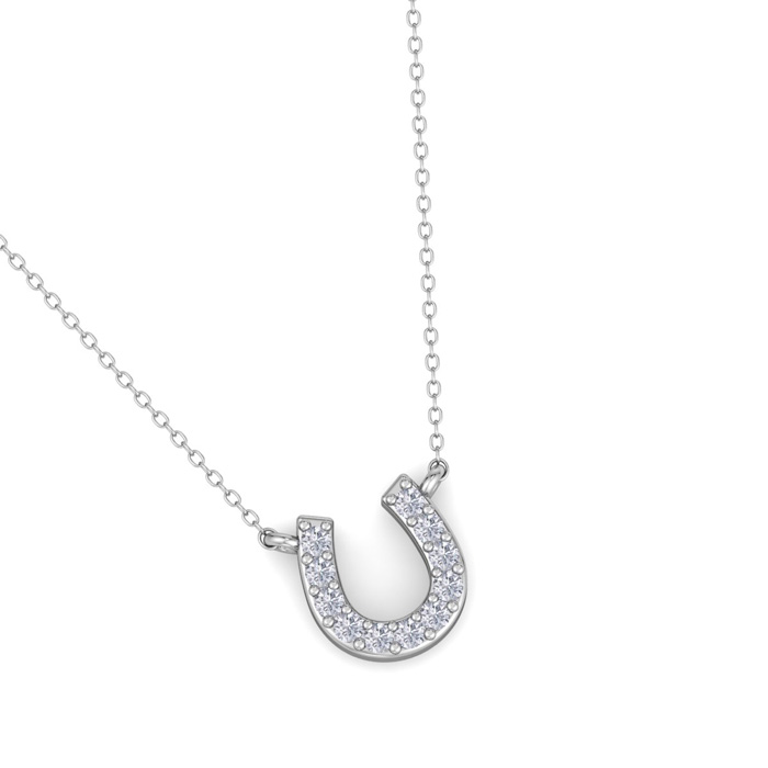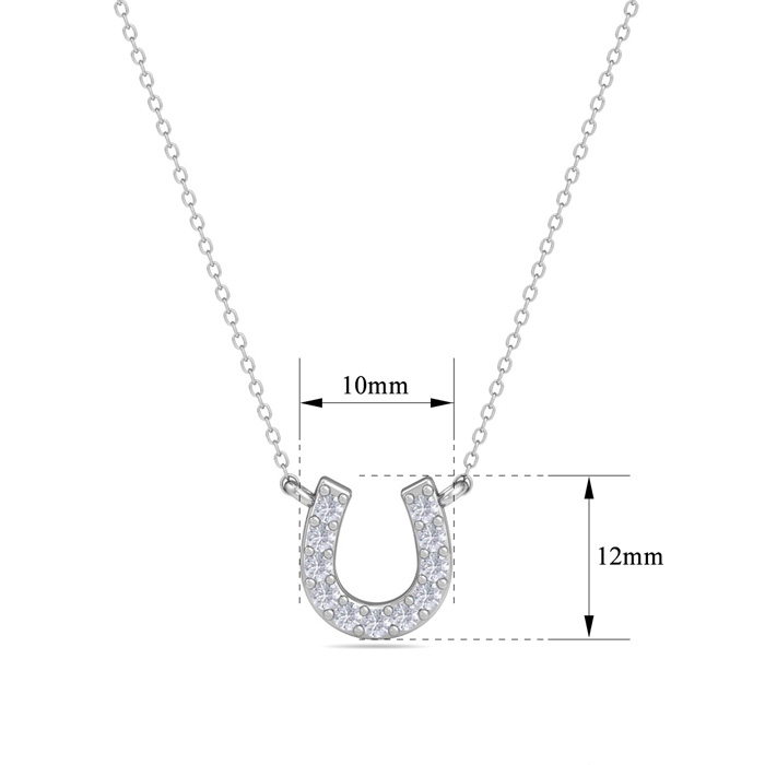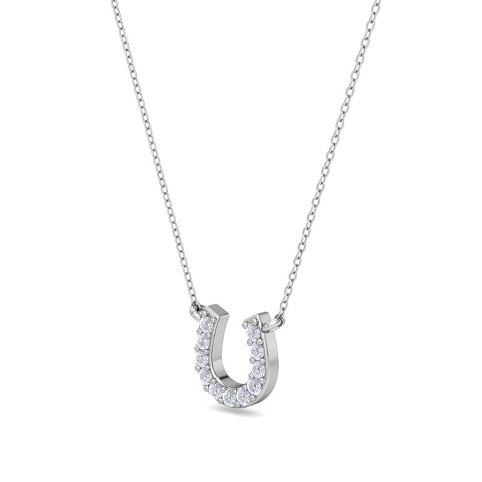 This diamond necklace features 11 sparkling lab grown diamonds adorning a horseshoe. Total carat weight is 0.06 carats. Diamond color is G-H, diamond clarity is VS. This necklace is in sterling silver and comes with an 18 inch cable chain with a spring-ring clasp.