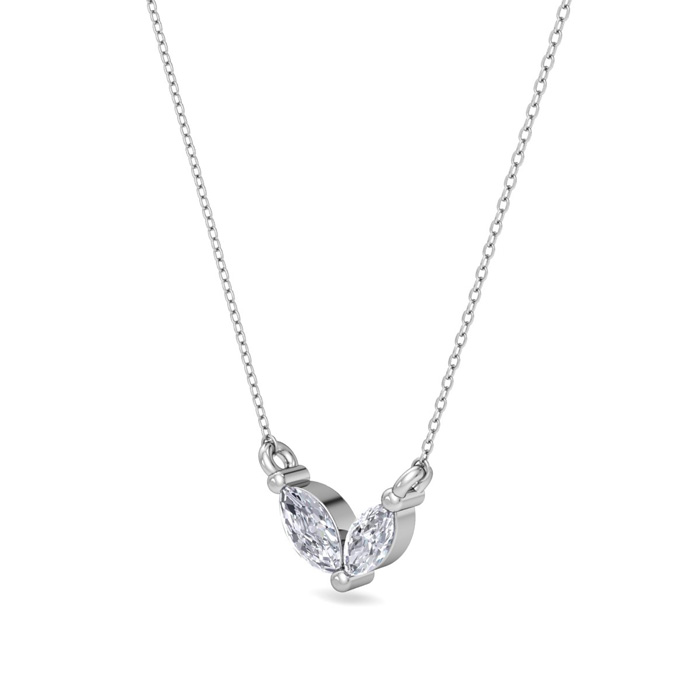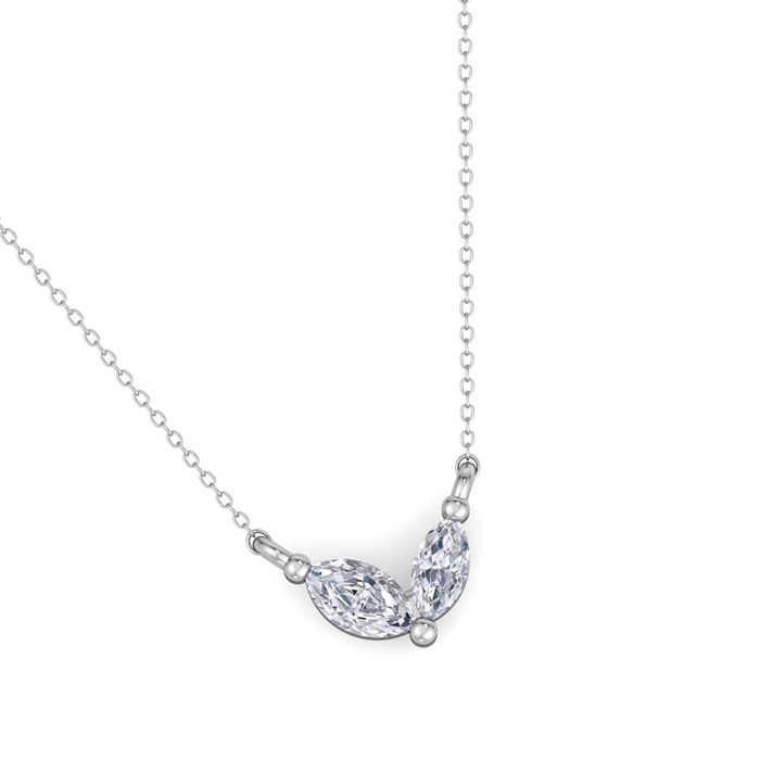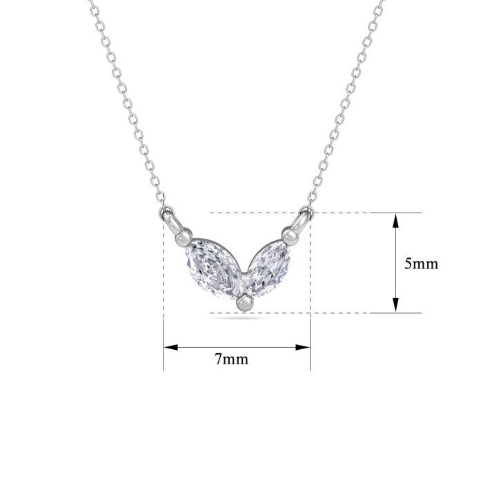 This diamond necklace features 2 sparkling marquise shape lab grown diamonds. Total carat weight is 0.14 carats. Diamond color is G-H, diamond clarity is VS. This necklace is in sterling silver and comes with an 18 inch cable chain with a spring-ring clasp.