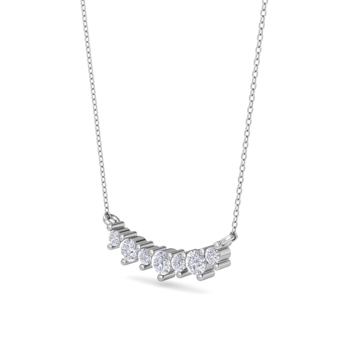 This diamond necklace features 7 sparkling lab grown diamonds in a journey. Total carat weight is 0.15 carats. Diamond color is G-H, diamond clarity is VS. This necklace is in sterling silver and comes with an 18 inch cable chain with a spring-ring clasp.
