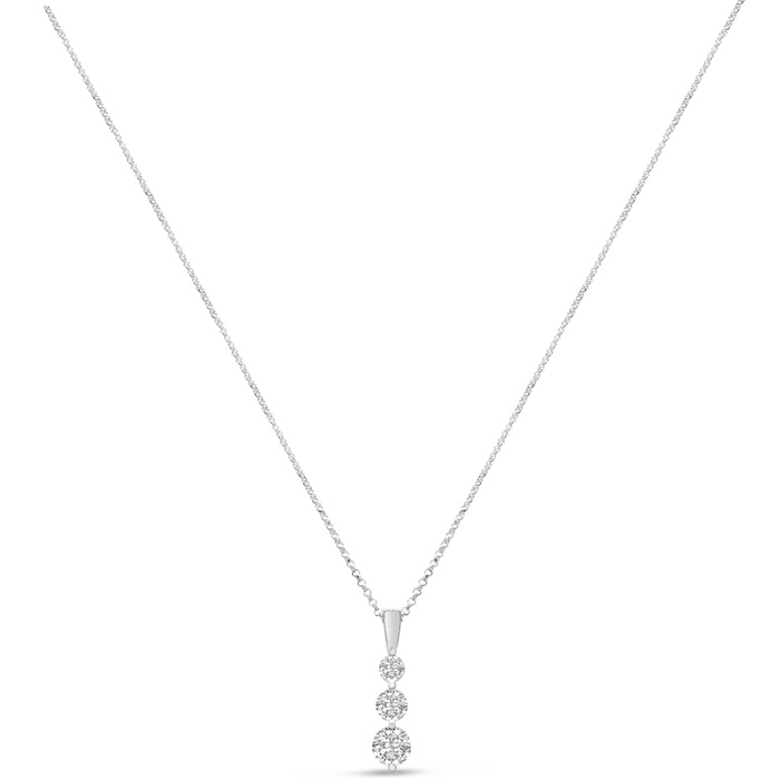This Lab Grown Diamond necklace features three Lab Grown - 1/3ct, 1/2ct and 2/3ct each. Total carat weight is 1 1/2 carat. Diamond color is G-H, diamond clarity VS. This necklace is in sterling silver and has an 18 inch cable chain with a spring-ring clasp. Pendant measures approximately 1 inch.