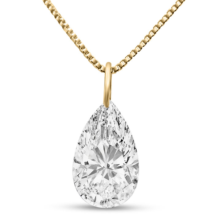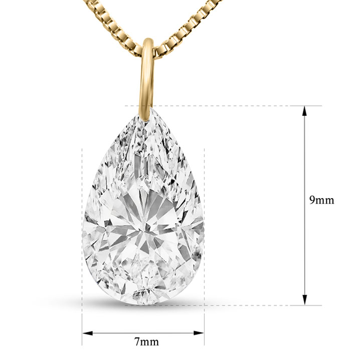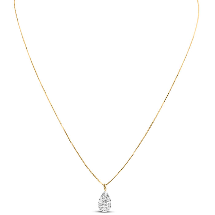 This amazing lab grown diamond necklace features one 9x7mm pear shape lab grown diamond. Lab grown diamond color is G-H, diamond clarity is VS. Total carat weight is approximately 1 1/2 carats. This pendant comes with a 14 karat yellow gold box chain with a spring-ring clasp.