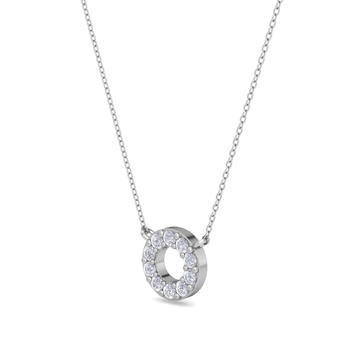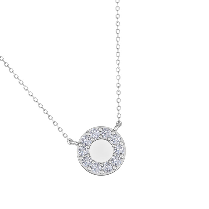 This diamond necklace features 10 sparkling lab grown diamonds in a circle. Total carat weight is 1/10 carat. Diamond color is G-H, diamond clarity is VS. This necklace is in sterling silver and comes with an 18 inch cable chain with a spring-ring clasp.