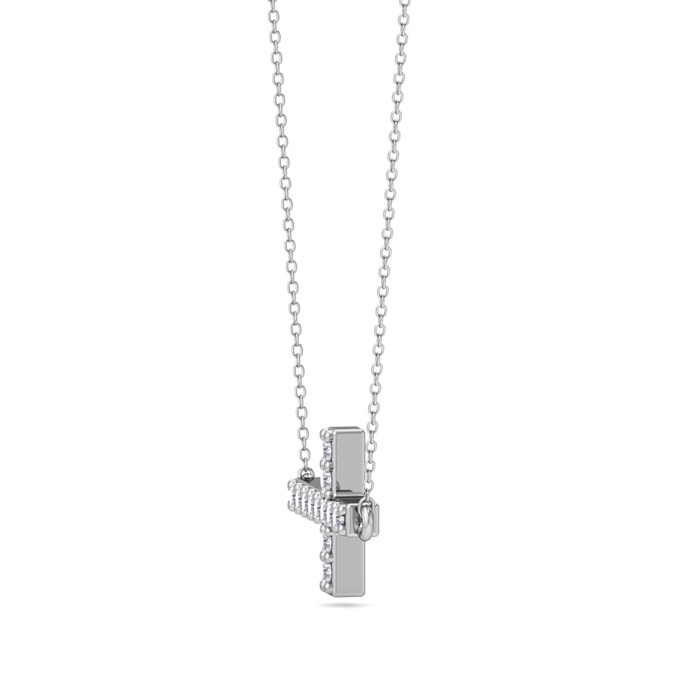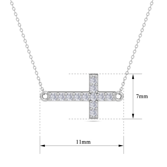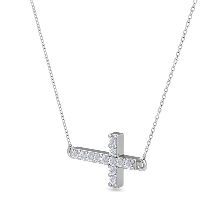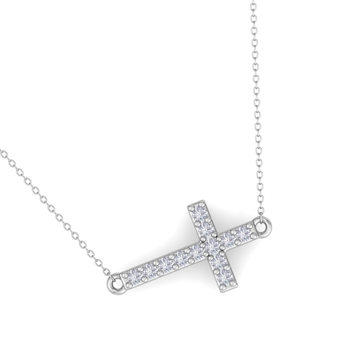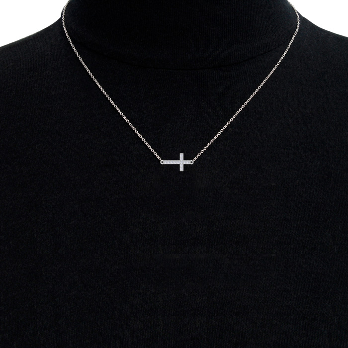 This diamond necklace features 12 sparkling lab grown diamonds along a sideways cross. Total carat weight is 1/10 carat. Diamond color is G-H, diamond clarity is VS. This necklace is in sterling silver and comes with an 18 inch cable chain with a spring-ring clasp.