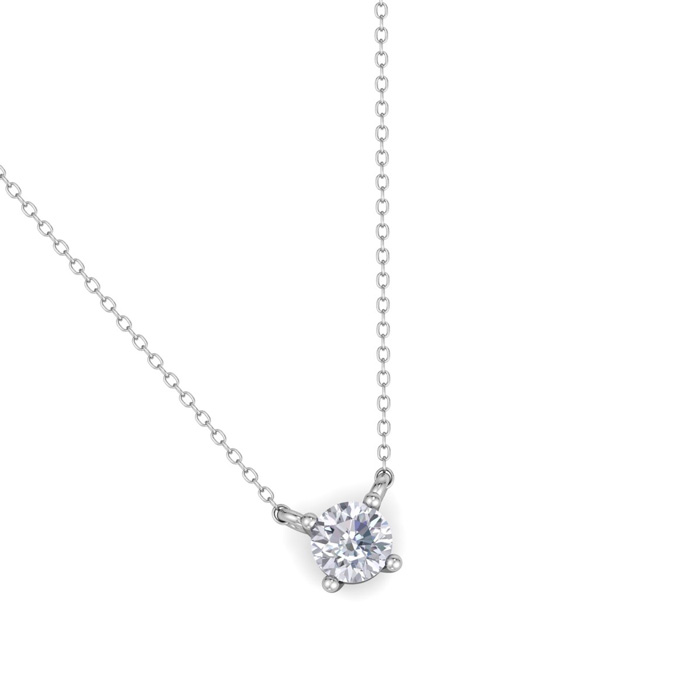 This diamond necklace features 1 sparkling lab grown diamond. Total carat weight is 1/10 carat. Diamond color is G-H, diamond clarity is VS. This necklace is in sterling silver and comes with an 18 inch cable chain with a spring-ring clasp.