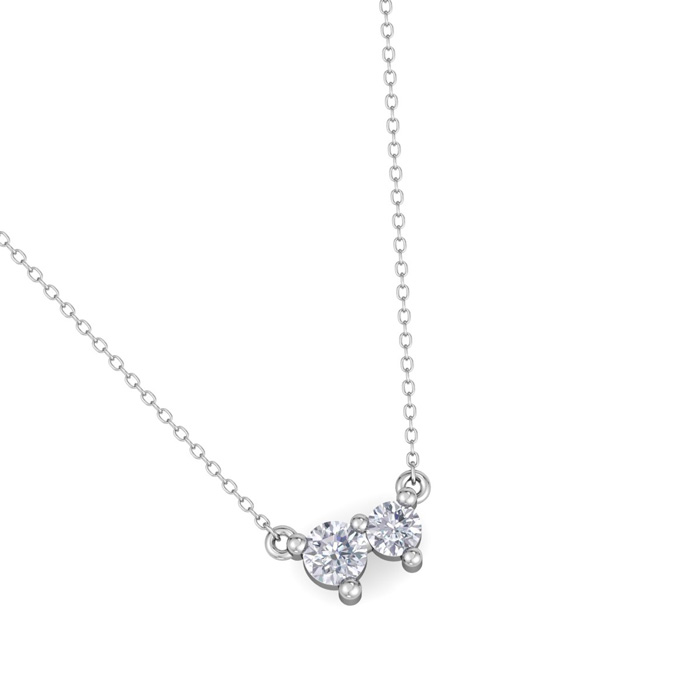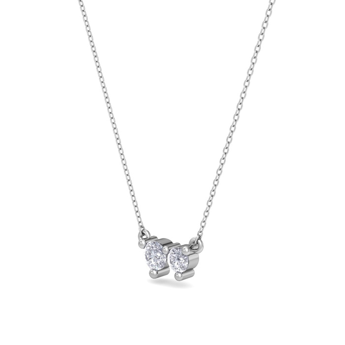 This diamond necklace features 2 sparkling lab grown diamonds. Total carat weight is 1/10 carat. Diamond color is G-H, diamond clarity is VS. This necklace is in sterling silver and comes with an 18 inch cable chain with a spring-ring clasp.