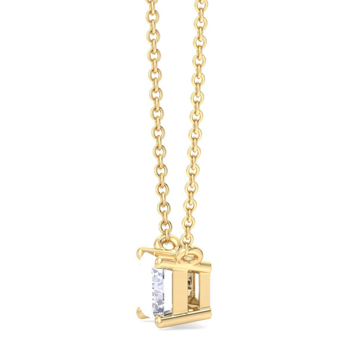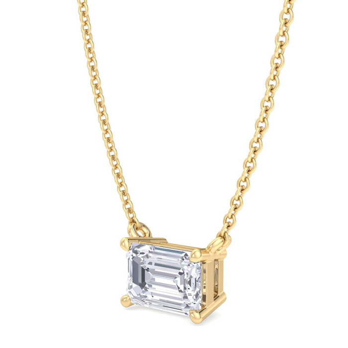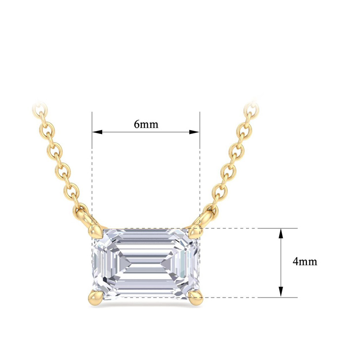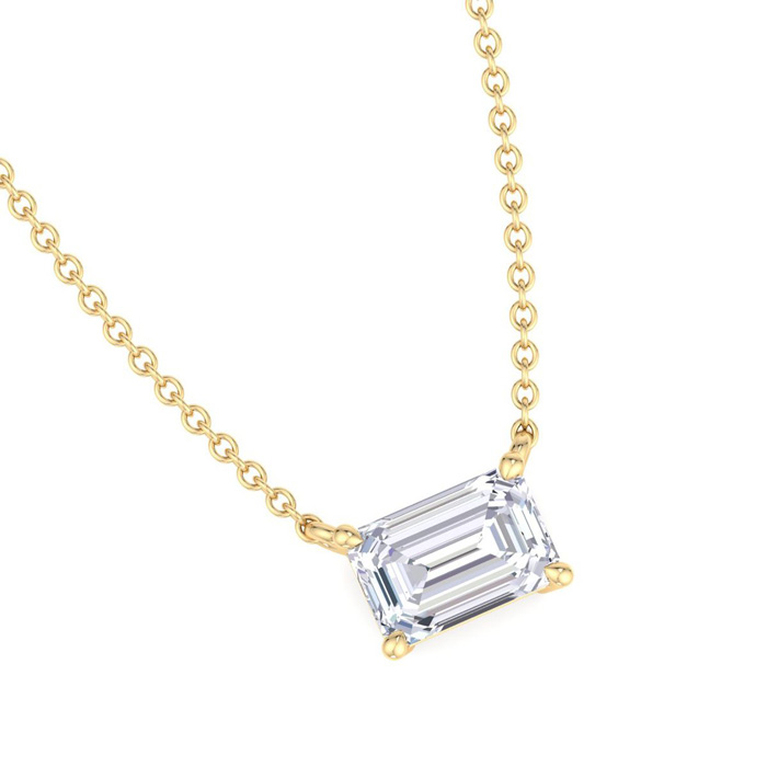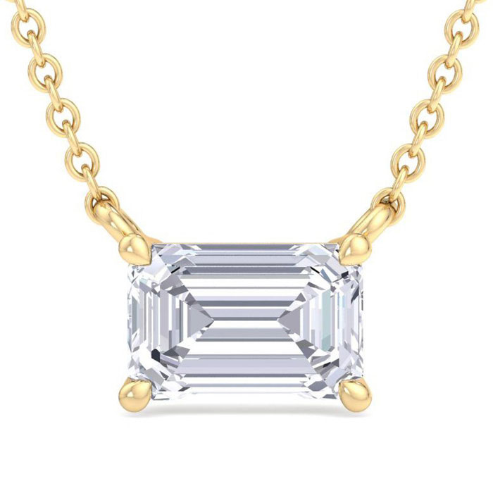 This lab grown diamond necklace features one emerald cut lab grown diamond in G-H color, VS2 clarity weighing approximately 1/2 carat. This necklace is in 14K Yellow Gold Over Sterling Silver and has an 18 inch cable chain with a spring-ring clasp.