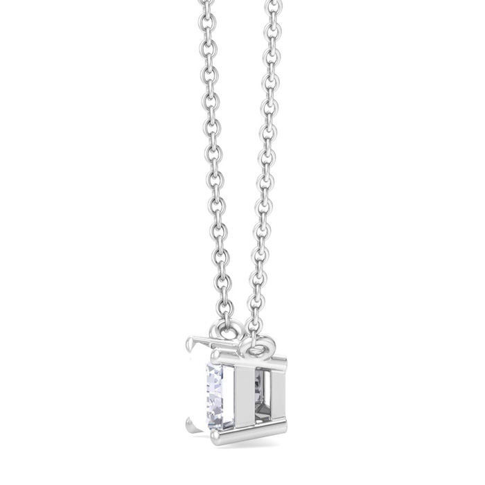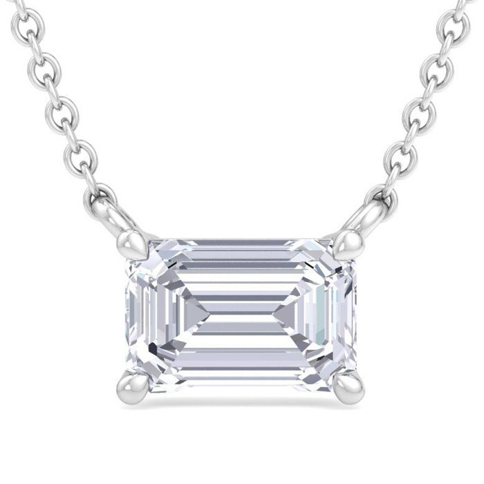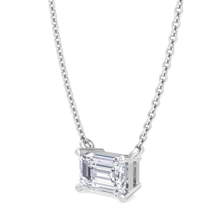This lab grown diamond necklace features one emerald cut lab grown diamond in G-H color, VS2 clarity weighing approximately 1/2 carat. This necklace is in Sterling Silver and has an 18 inch cable chain with a spring-ring clasp.
