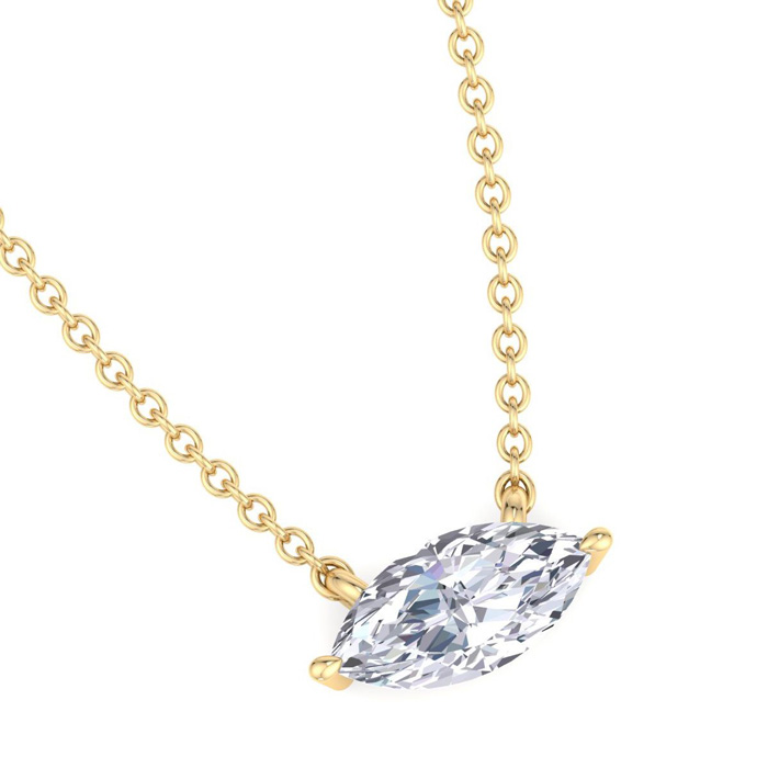 This lab grown diamond necklace features one marquise shape lab grown diamond in G-H color, VS2 clarity weighing approximately 1/2 carat. This necklace is in 14 karat yellow gold and has an 18 inch cable chain with a spring-ring clasp.