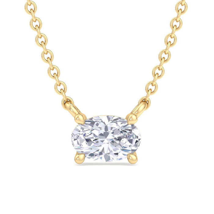 This lab grown diamond necklace features one oval shape lab grown diamond in G-H color, VS2 clarity weighing approximately 1/2 carat. This necklace is in 14K Yellow Gold Over Sterling Silver and has an 18 inch cable chain with a spring-ring clasp.